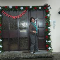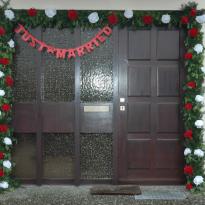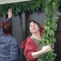Die Haustüre des Brautpaares wird geschmückt mit einem Kranz aus Tannreisig und weißen und roten "Rosen"