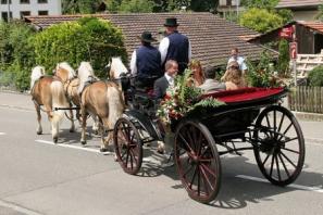 Braut und Bräutigam sind gemeinsam mit den Trauzeugen zu einer Kutschfahrt in der Hochzeitskutsche rund um Büsingen gestartet, während sich die Gäste an Sekt und Brötchen stärken konnten.